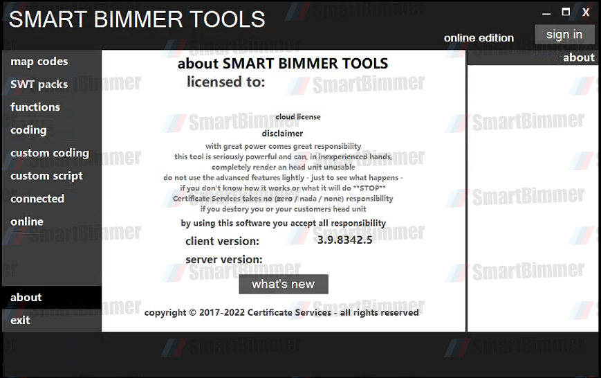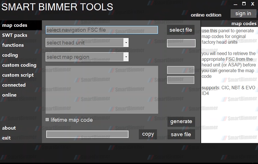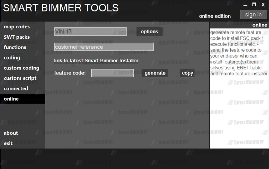 Download the SmartBimmer Client Tool. Please let us know which features you would like for your car, and we will send you the corresponding codes. Our codes do not expire and can be used multiple times on the same vehicle.